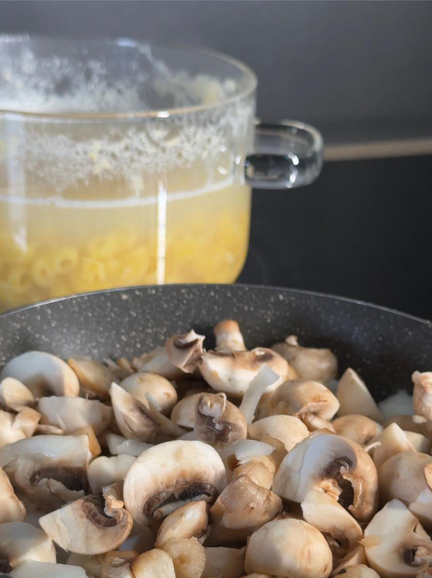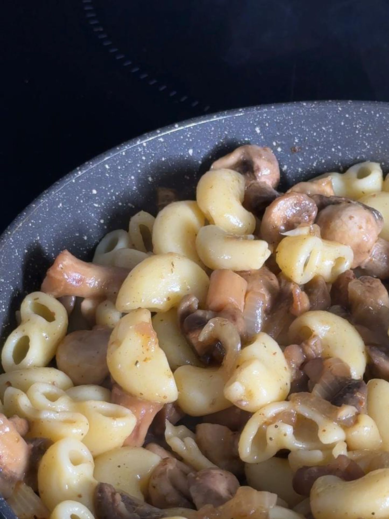 4. Nakon što se gljive i luk skuhaju, dodajte skuhanu tjesteninu i sjedinite.